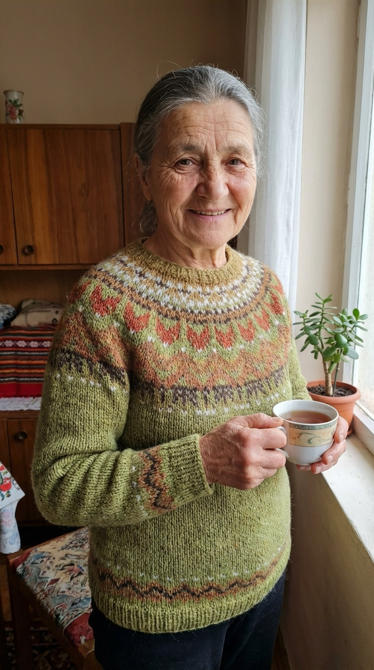 Bohatý tradiční vzor: Detailní vícebarevné motivy dodávají autentickou estetiku ručně pletených severských svetrů.
